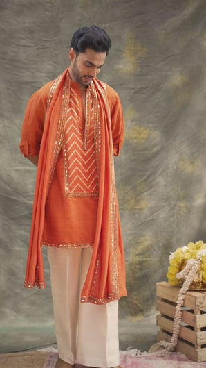 A refined expression of festive elegance, this ensemble is designed for the modern man who values timeless craftsmanship with a contemporary edge. The kurta, tailored in luxurious raw silk, features a striking chevron panel highlighted with delicate hand-embroidered mirror work and fine pin-tuck detailing, adding depth, texture, and a subtle festive shimmer. The look is elevated with a matching raw silk dupatta, finished with a hand-embroidered mirror border on all four sides, lending a regal and ceremonial touch. Paired with classic ivory trousers, the ensemble achieves a perfect balance of richness and restraint.