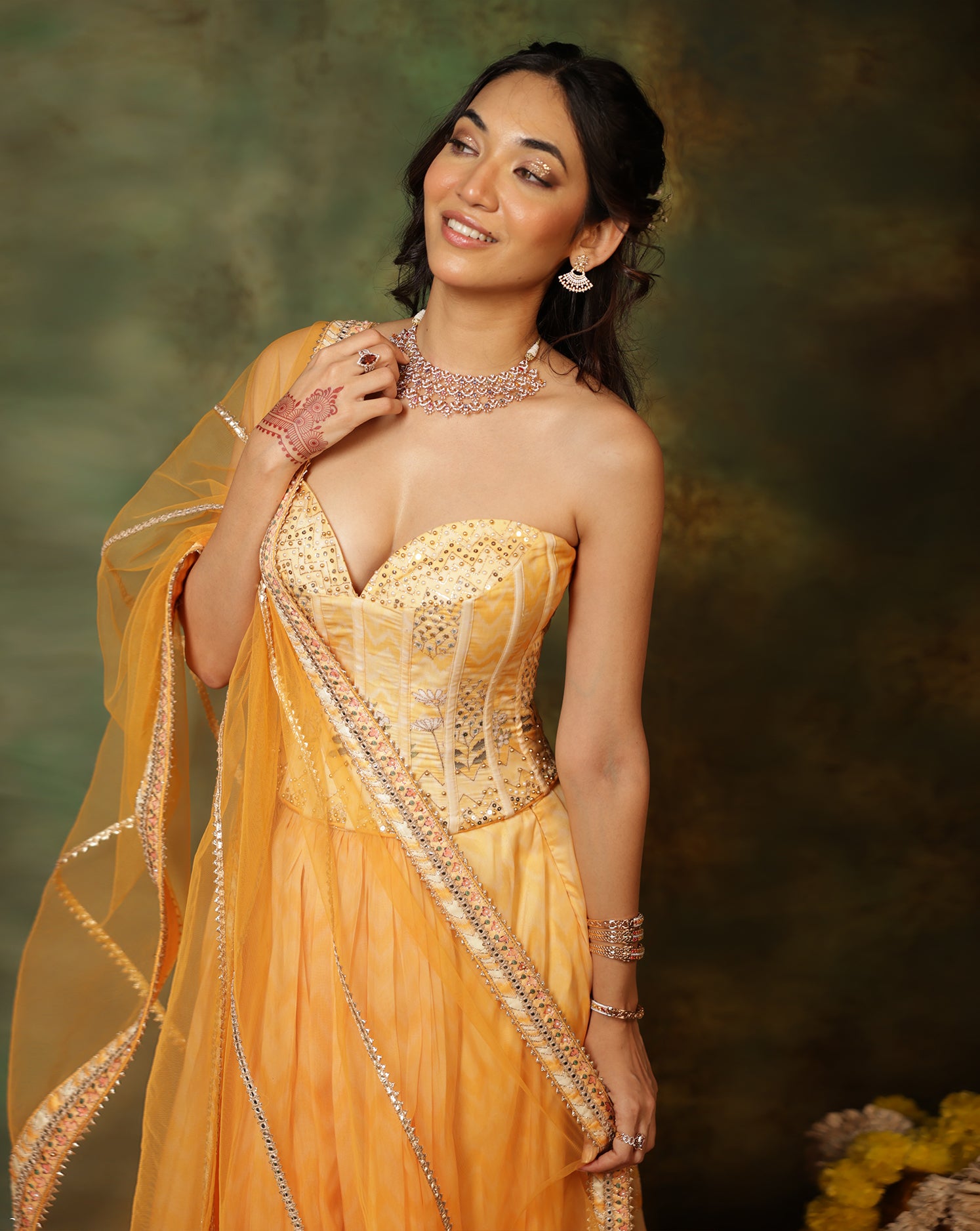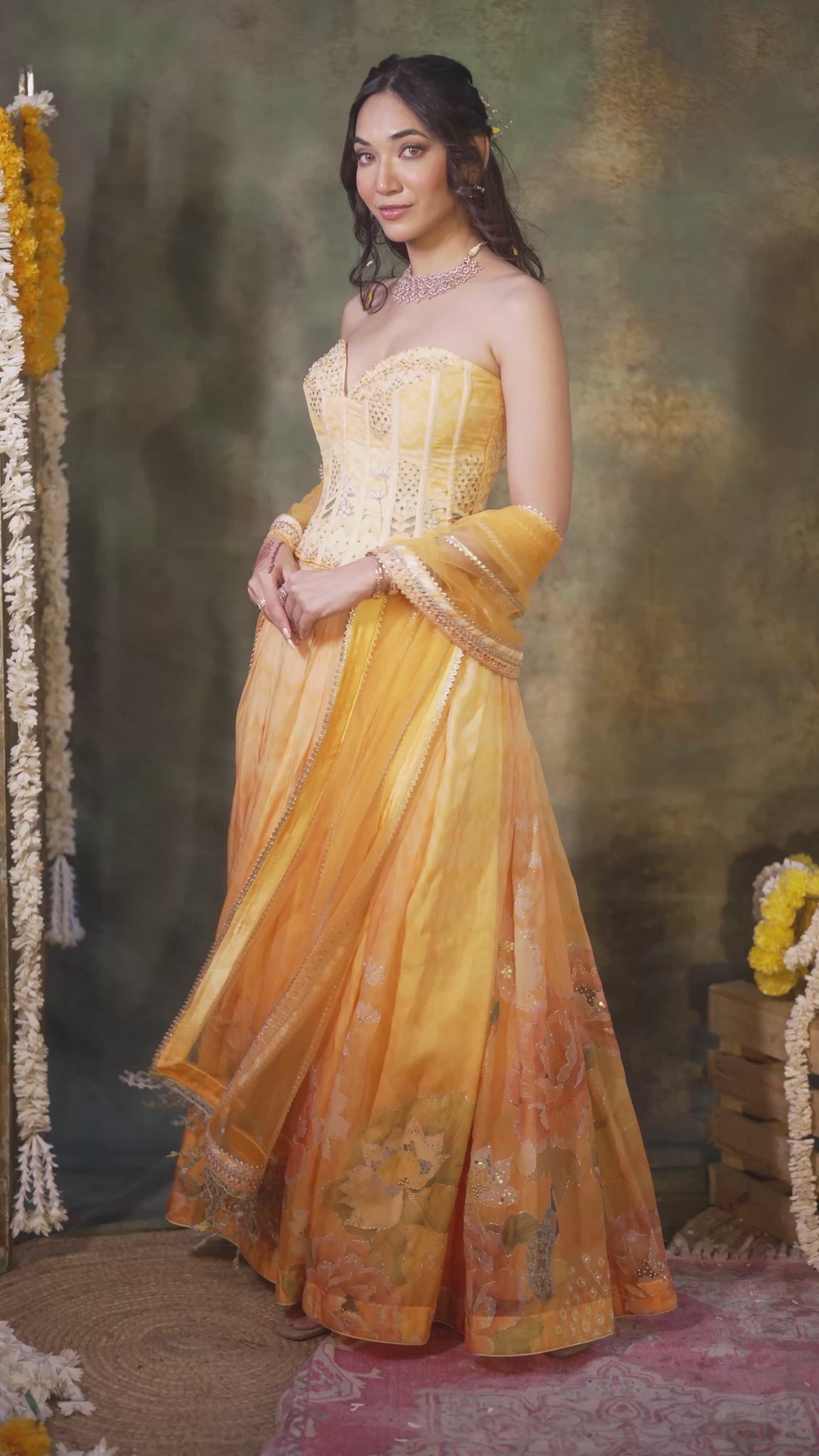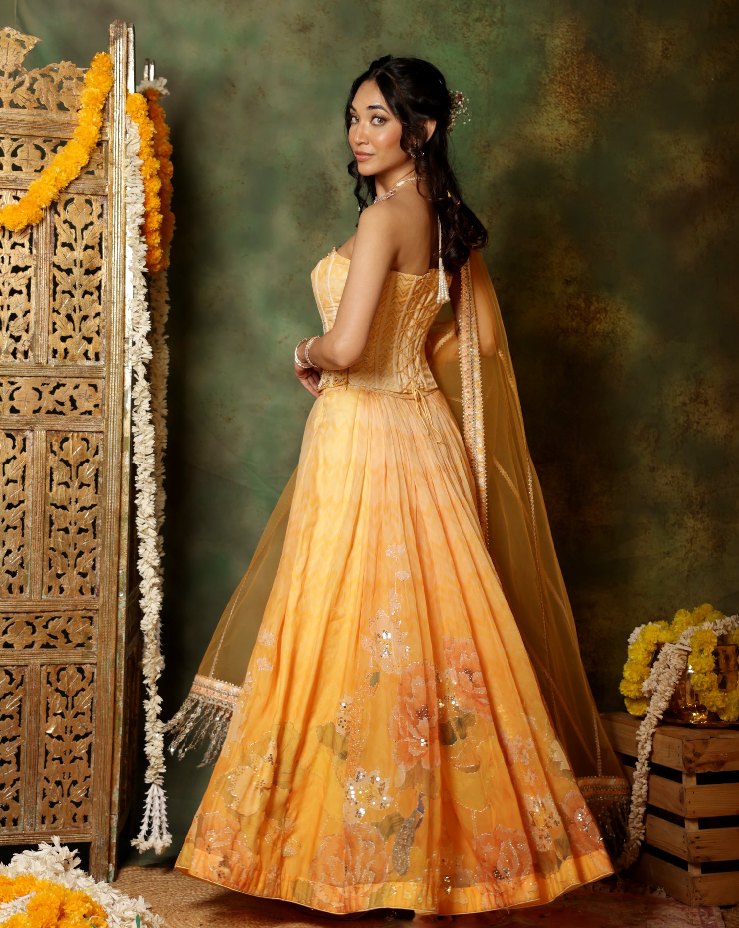 Enveloped within a warm golden glow, this Corset Lehenga from our Gulmora Collection brings together vibrant florals, delicate detailing, and effortless festive elegance. The organza lehenga features a bold floral print enhanced with soft sequin highlighting, creating a light, airy silhouette perfect for daytime celebrations.