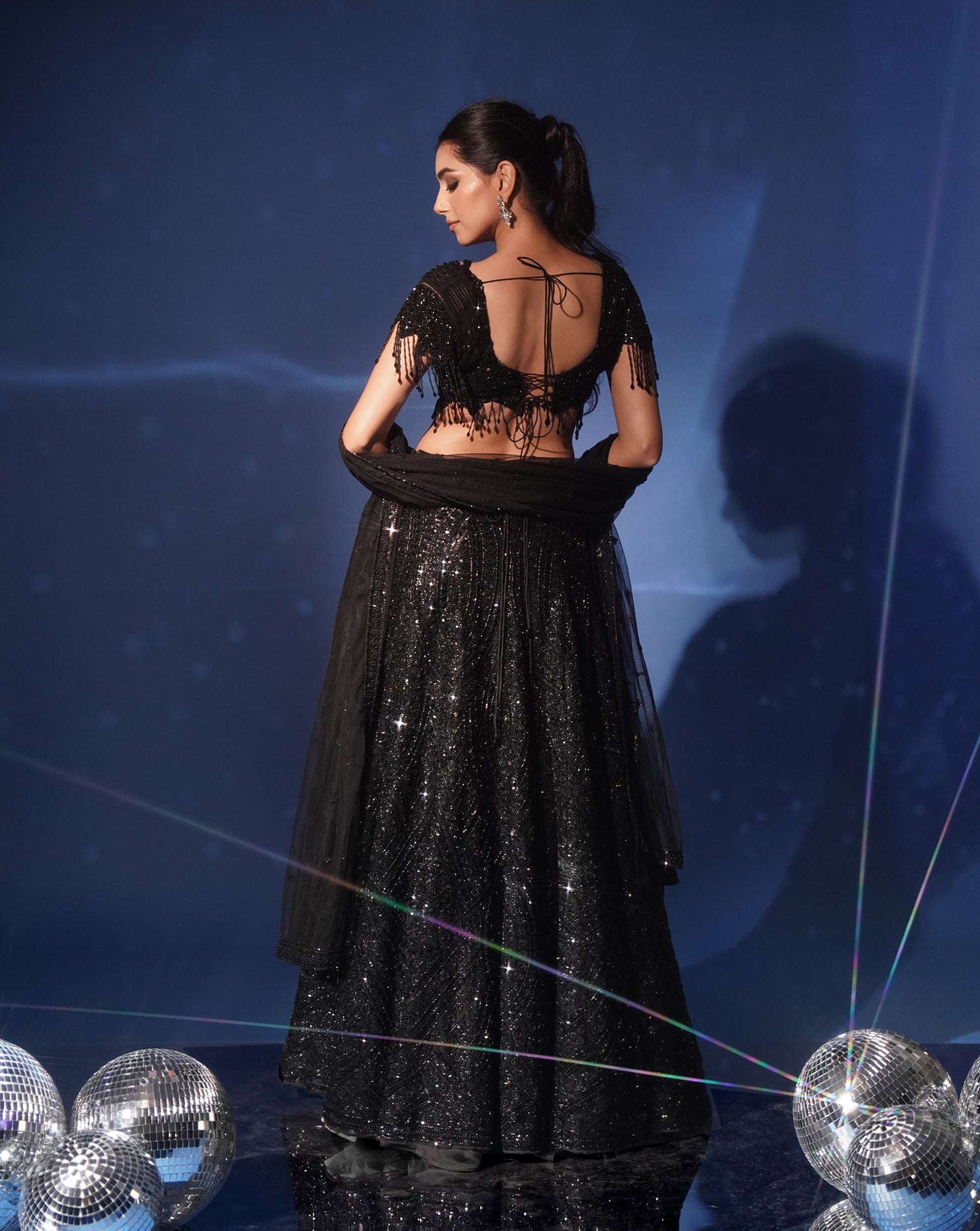 Enveloped in the mystique of midnight black, this lehenga set is the epitome of modern glamour and timeless elegance. The sequined net lehenga glimmers with intricate all-over sequin and bead embroidery, creating a mesmerizing play of light with every movement.The statement blouse is adorned with delicate sequin work and fringed tassel detailing on the sleeves and hem, lending a contemporary edge to the classic silhouette while the sheer net dupatta offers a soft, graceful balance to the high-shine glamour.