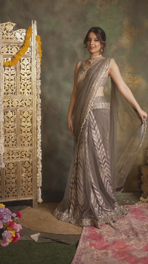 Enveloped in elegant taupe hues, this draped saree from the Rangmanch Collection is a refined expression of festive sophistication. Crafted in net and dola silk, the saree features chevron-patterned shimmer detailing that creates fluid movement and a subtle glow. A hand-embroidered gota and mirror border enhances the drape with traditional sparkle, while delicate pearl tassels add a soft, graceful finish. Paired with a contemporary body-suit–style blouse, this ensemble is perfect for weddings, festive evenings, and elevated celebrations.