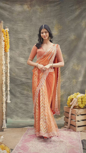 Enveloped in warm saffron hues, this draped saree crafted in dola silk and net features chevron-patterned shimmer detailing that reflects light beautifully. A hand-embroidered gota and mirror border adds traditional sparkle, while pearl tassels on the pallu and delicate pearl drop accents across the outfit lend a soft, refined elegance. Paired with a heavily embellished gota patti blouse with pearl detailing, this ensemble is perfect for festive celebrations and special occasions.
