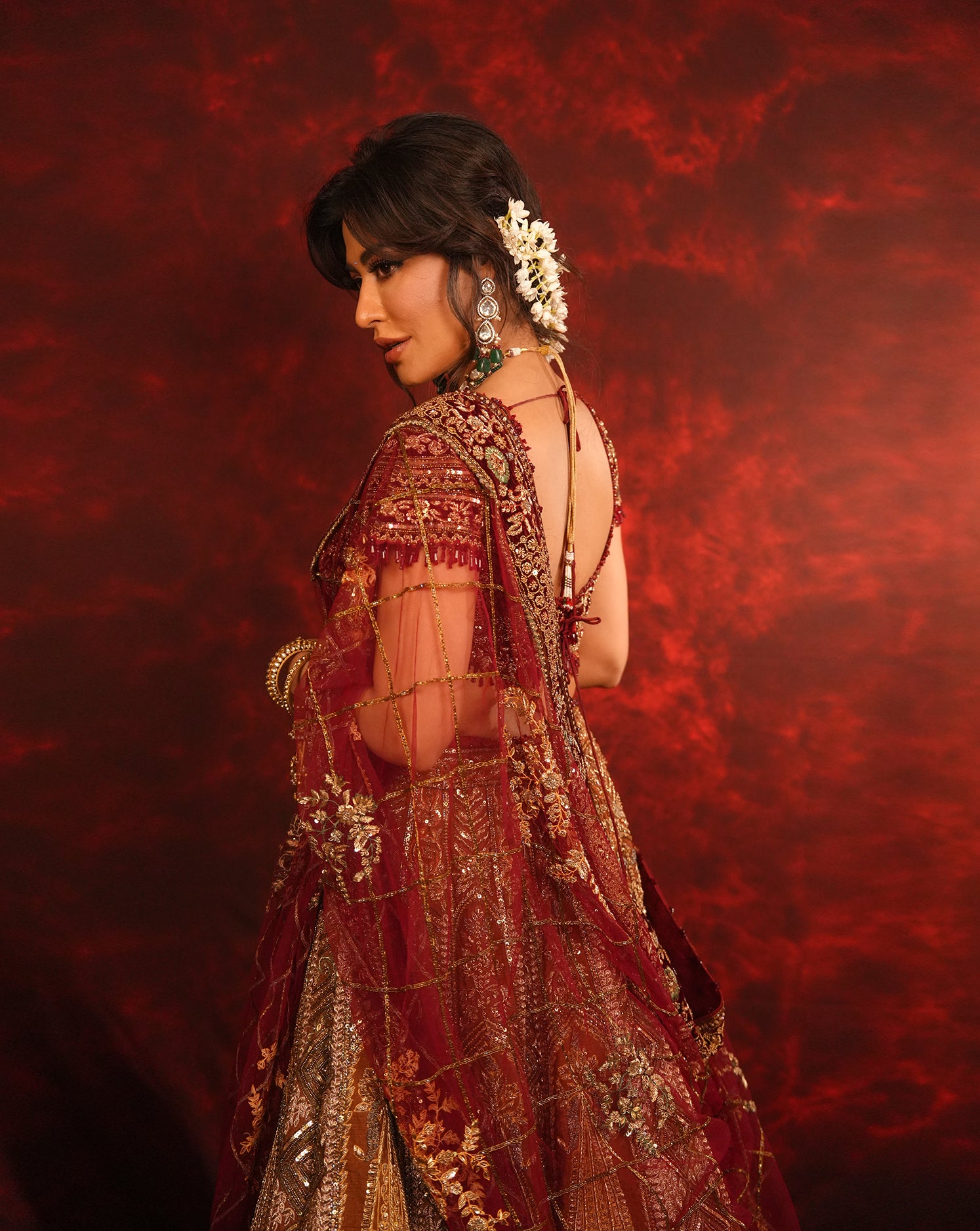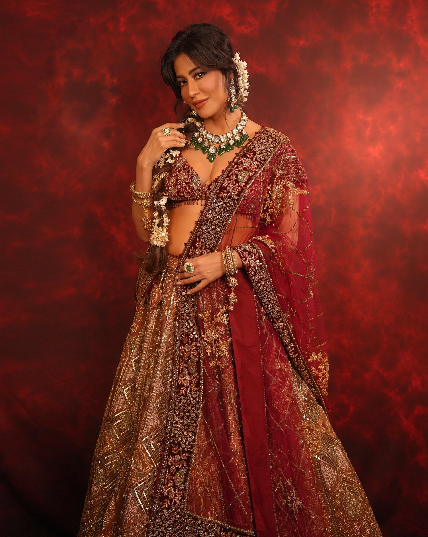 Enveloped in regal hues of deep maroon and Antique gold, this exquisite bridal lehenga is a masterpiece of opulence and tradition. The richly embroidered velvet and silk ensemble glimmers with intricate zardozi, sequins, and resham detailing, weaving together motifs of grandeur and grace. The blouse, adorned with elaborate embellishments and delicate fringe accents, perfectly complements the voluminous lehenga that sparkles with ornate handwork and layered patterns. Draped effortlessly, the sheer dupatta with its ornate border adds a touch of ethereal charm, completing this royal vision.